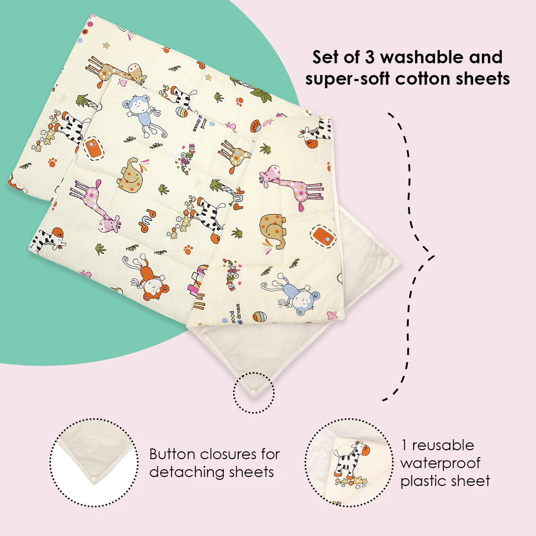 > Set of 3 cotton sheets which can be changed when soiled and affixed to 1 reusable plastic sheet with the help of button closures
